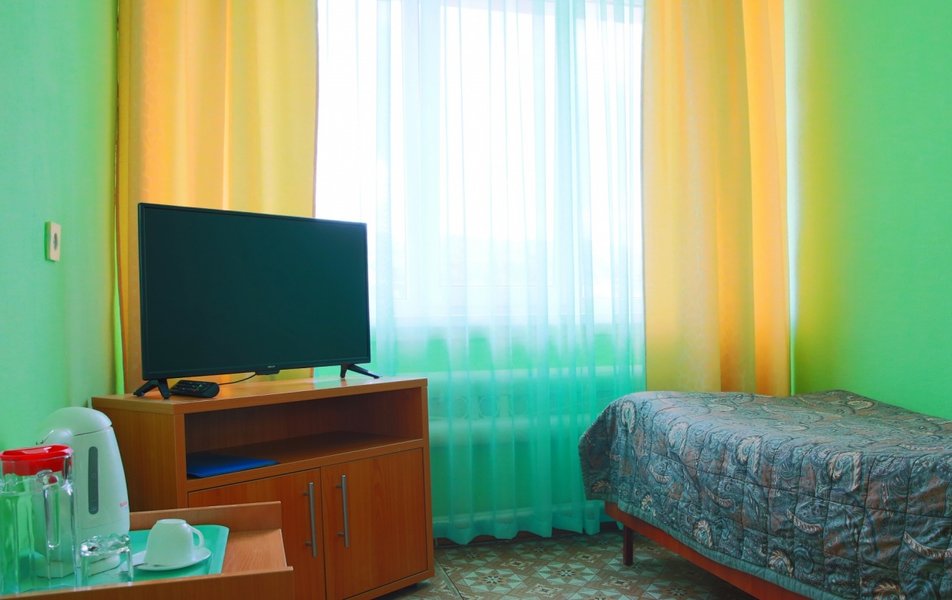 1 осн. место. Мебель: зеркало, кровать односпальная, прикроватная тумбочка, столик журнальный, стул, шкаф. Оборудование: телевизор, холодильник (общий на 3 номера), чайный набор посуды, электрочайник (общий на 3 номера). Санузел на блок. Сервис: Wi-Fi бесплатно, смена полотенец, смена постельного белья, уборка номера.