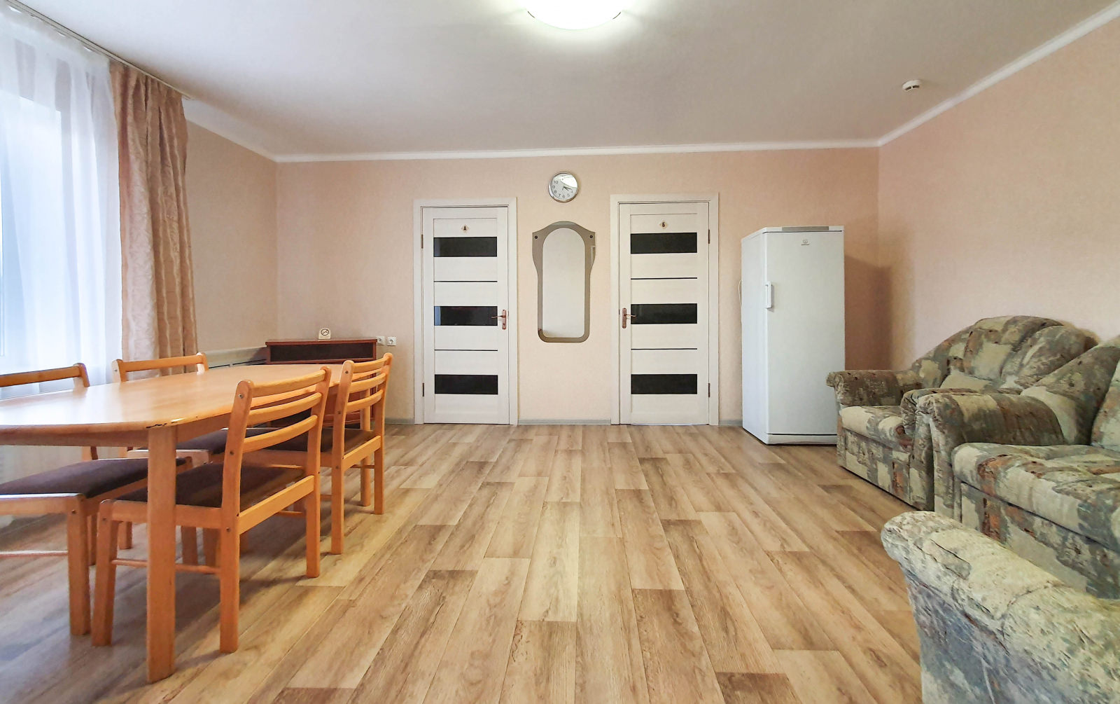 2 осн. места. Мебель: зеркало, кровати односпальные, прикроватные тумбочки, стол, стулья, шкаф. Оборудование: холодильник (общий на 3 номера), чайный набор посуды, электрочайник (общий на 3 номера). Санузел на блок. Сервис: Wi-Fi бесплатно, смена полотенец, смена постельного белья, уборка номера.