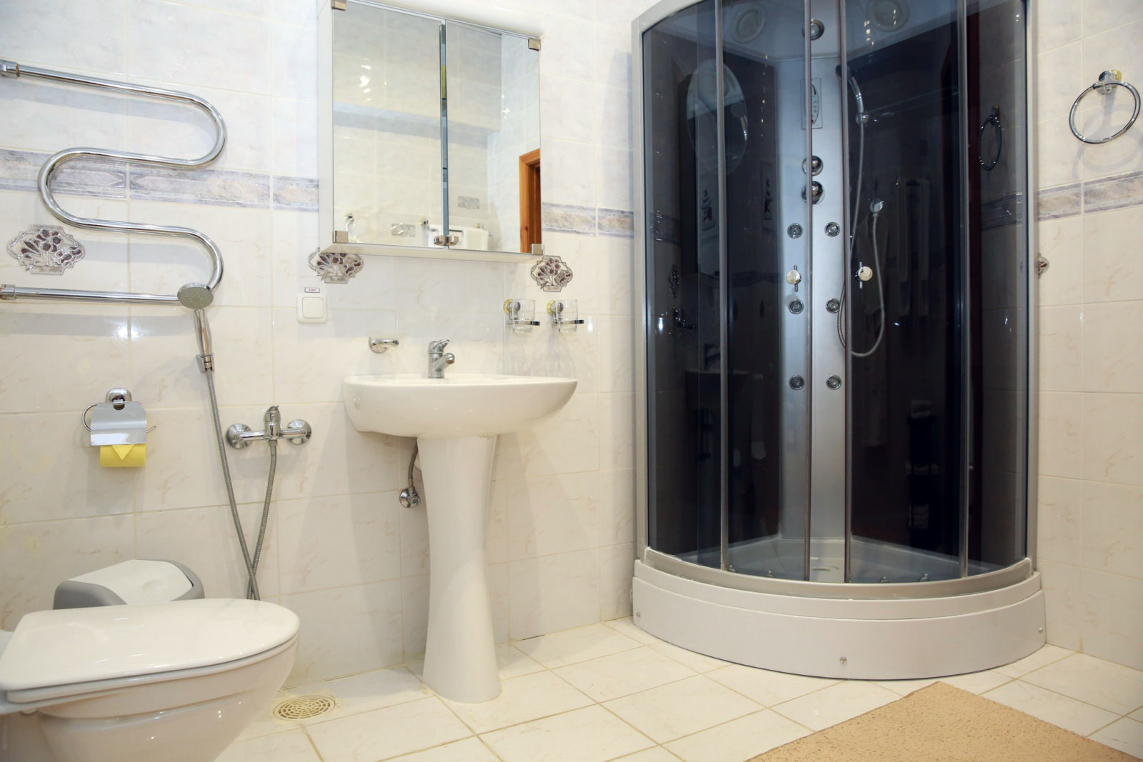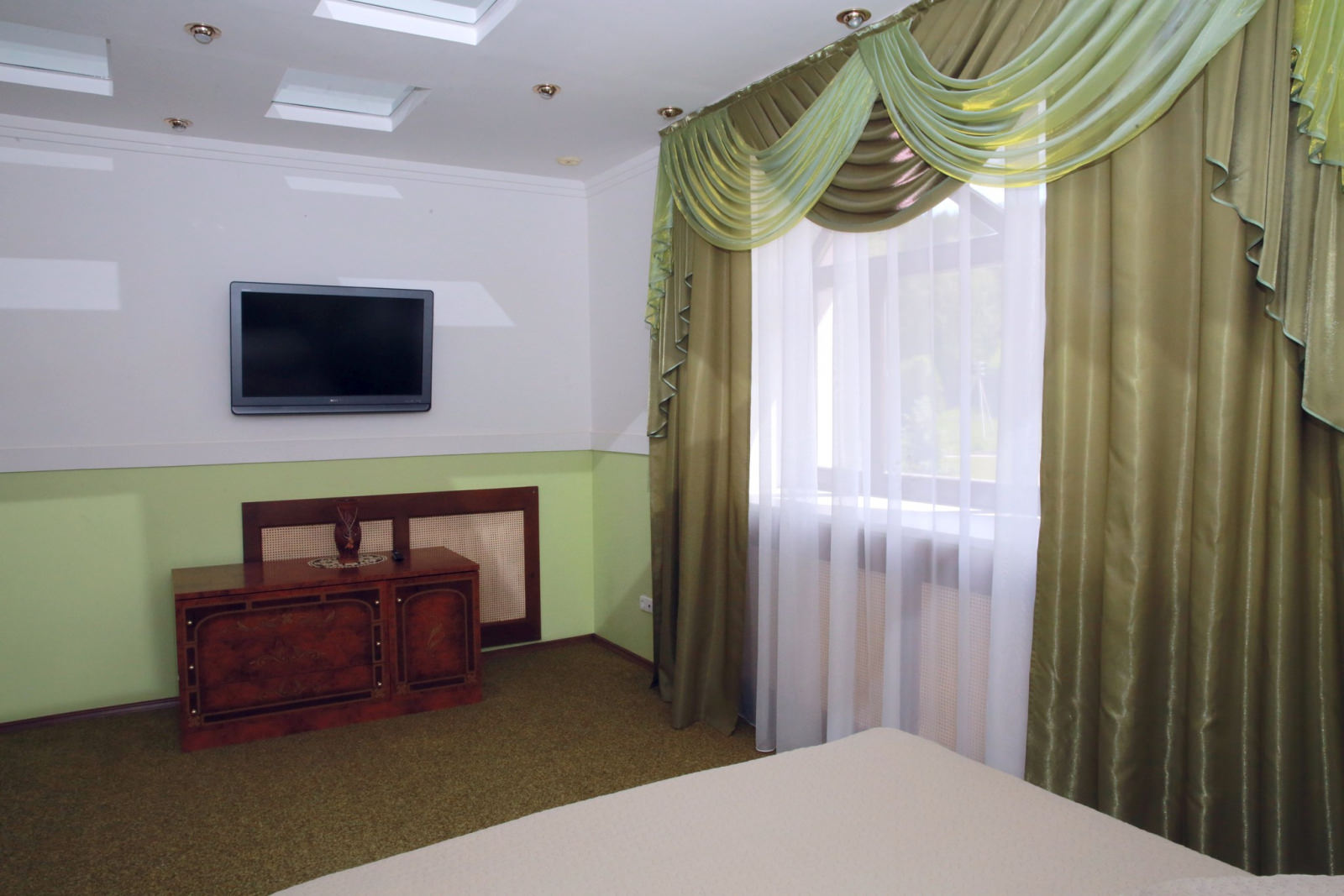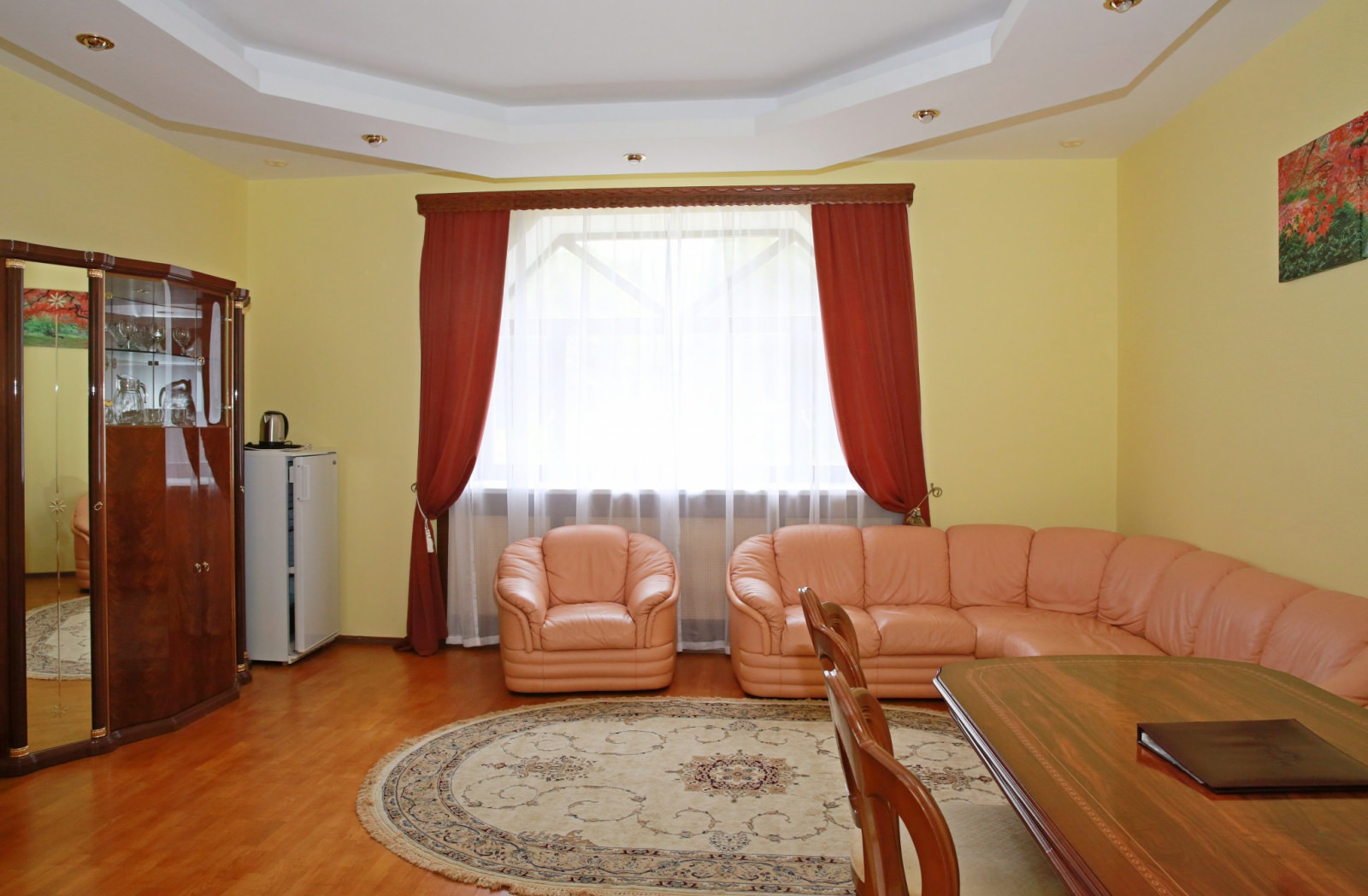 Площадь номера - 66 кв.м. 1 осн. место. 3 доп. места. Мебель: диван, зеркало, кресла, кровать двуспальная, прикроватные тумбочки, стол, столик журнальный, стулья, шкаф. Оборудование: гладильная доска, кондиционер, сейф, сушилка для белья, телевизор, утюг, холодильник, чайный набор посуды, электрочайник. Санузел: с душевой кабиной, тапочки, туалетные принадлежности, фен, халат. Сервис: Wi-Fi бесплатно, смена полотенец, смена постельного белья, уборка номера.