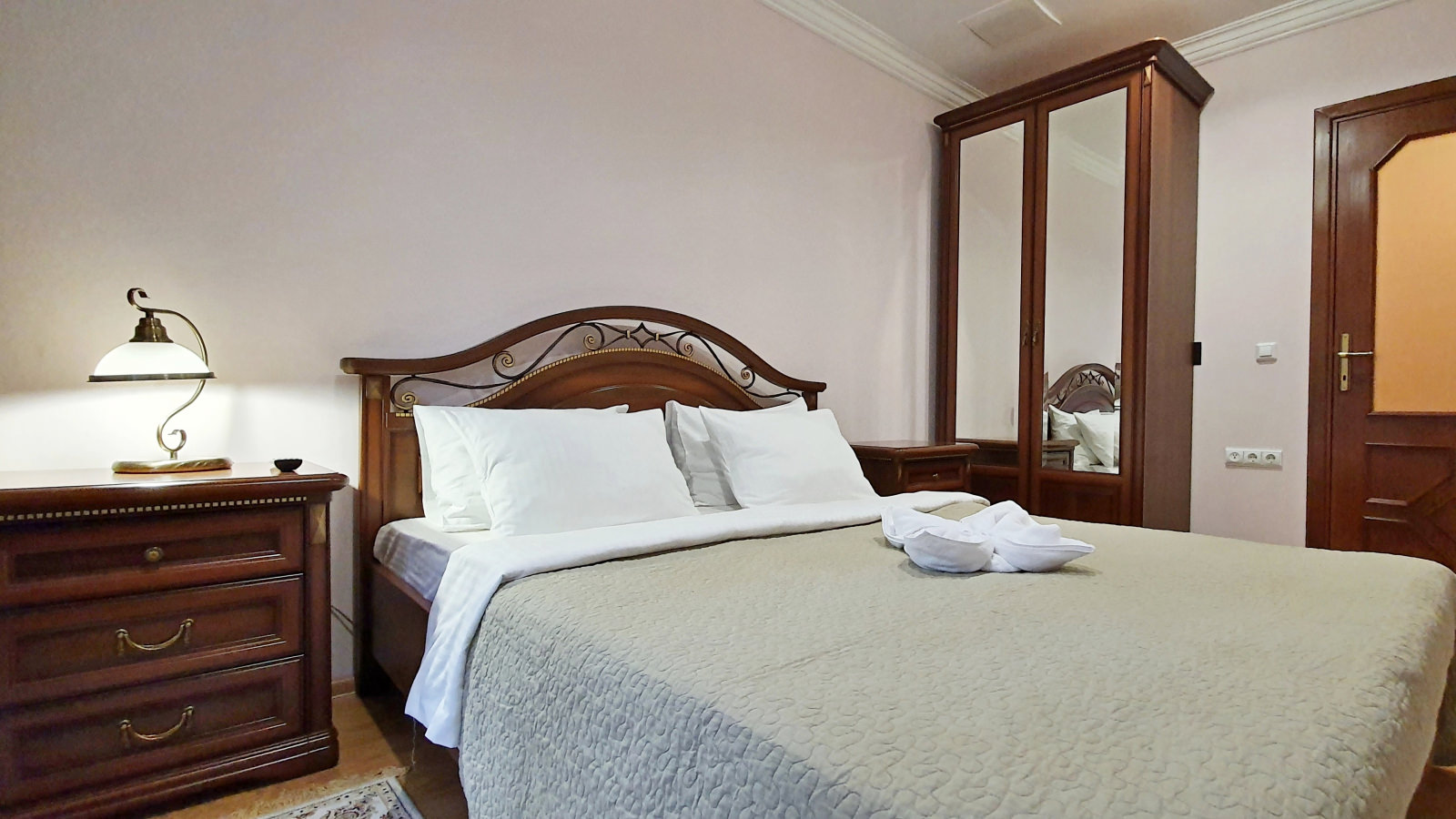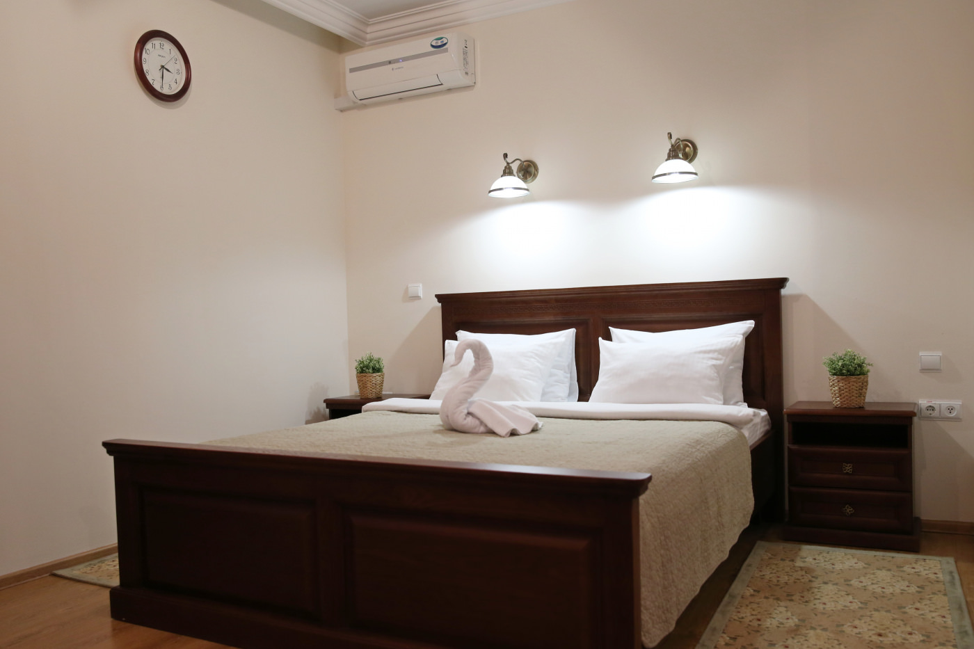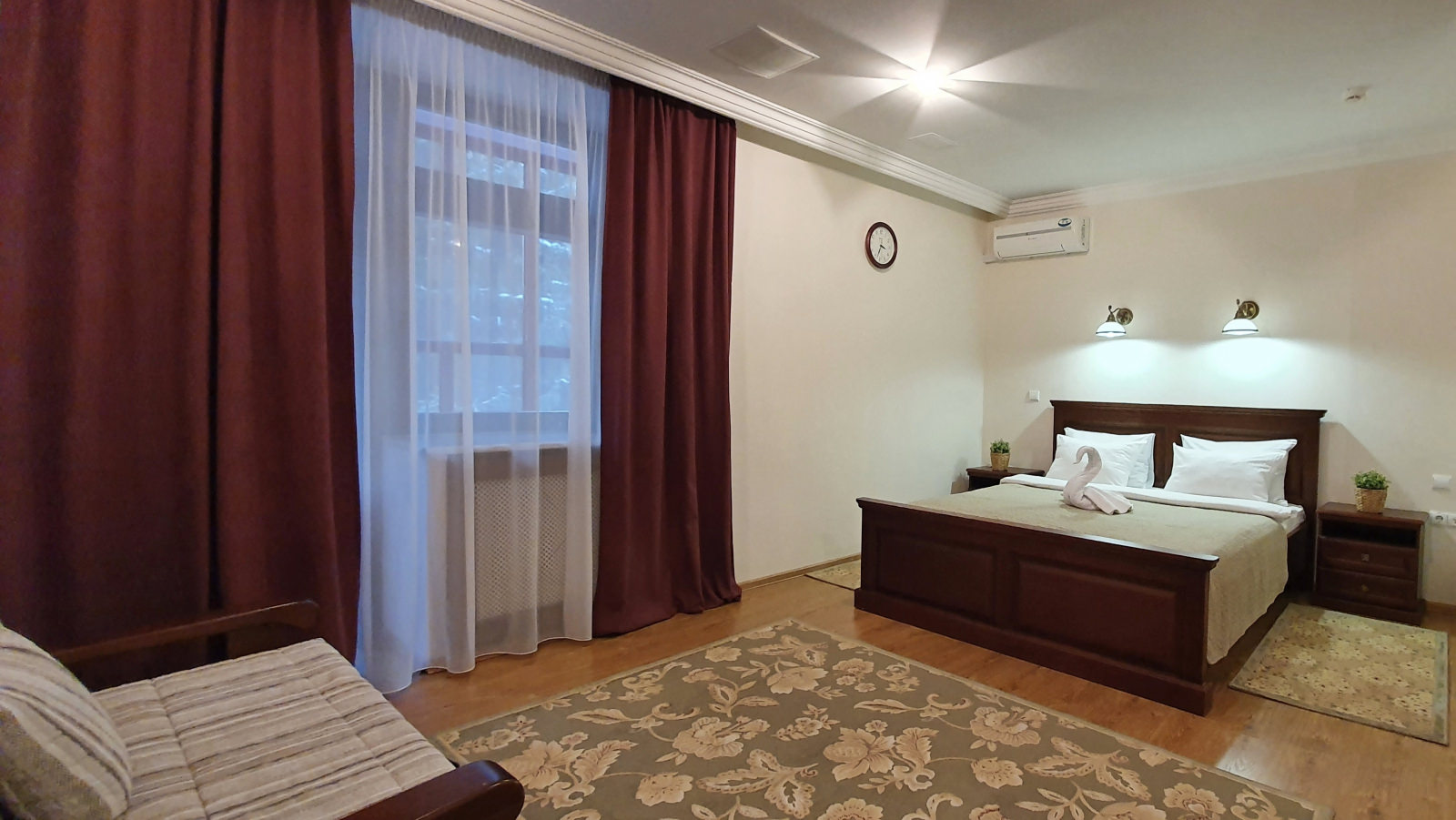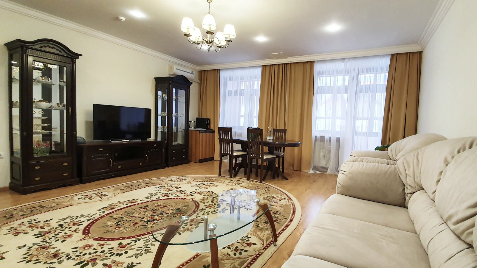 1 осн. место. 3 доп. места. Мебель: диван, зеркало, кресла, кровать двуспальная (2 шт.), набор мягкой мебели, прикроватные тумбочки, стол, столик журнальный, стол обеденный, стулья, шкаф. Оборудование: кондиционер, набор посуды, сейф, стиральная машина, телевизор, телефон, холодильник, электрочайник. Санузел: с ванной, тапочки, туалетные принадлежности, фен, халат. Сервис: Wi-Fi бесплатно, смена полотенец, смена постельного белья, уборка номера.