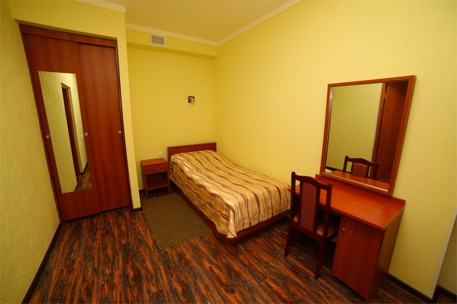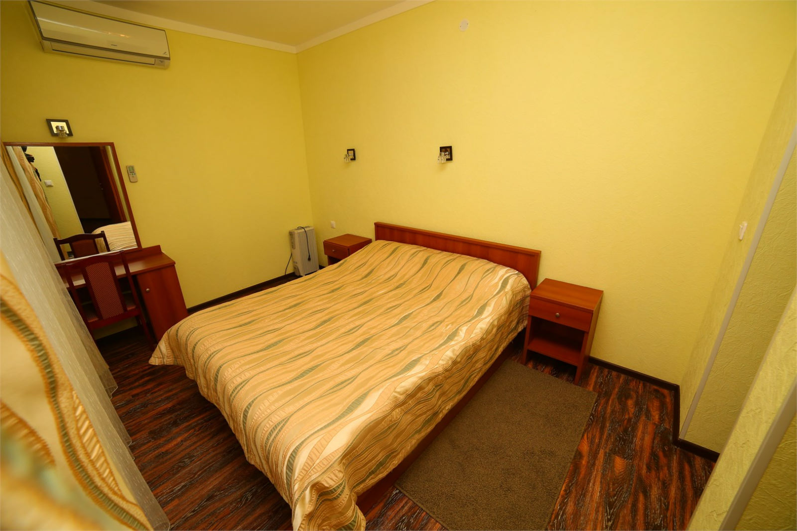 Площадь номера - 50 кв.м. 2 осн. места. 2 доп. места. Мебель: диван, зеркало, комод, кровать двуспальная, кровать односпальная, прикроватные тумбочки, стол, столик журнальный, стулья, шкаф. Оборудование: телевизор, телефон, холодильник, чайный набор посуды, электрочайник. Санузел: с ванной/душем, тапочки, туалетные принадлежности, фен, халат. Сервис: Wi-Fi бесплатно, смена полотенец, смена постельного белья, уборка номера.