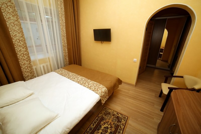 Площадь номера - 16 кв.м. 1 осн. место. 1 доп. место. Балкон. Мебель: зеркало, кровать двуспальная, прикроватные тумбочки, стол, стулья, шкаф. Оборудование: сейф, телевизор, телефон, холодильник, чайный набор посуды, электрочайник. Санузел: с душевой кабиной, туалетные принадлежности, фен. Сервис: Wi-Fi бесплатно, смена полотенец, смена постельного белья, уборка номера.